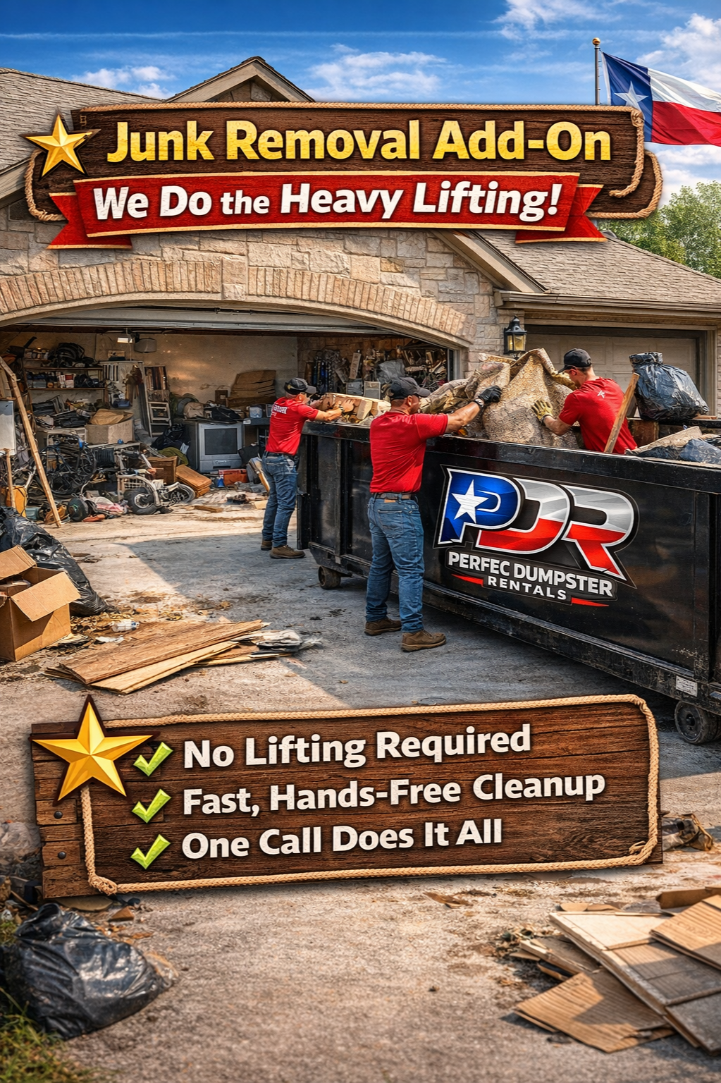 At Perfec Dumpster Rentals, we believe cleanup should be simple. If you’re renting a dumpster and don’t want to do all the lifting yourself, our junk removal add-on service is here to help.